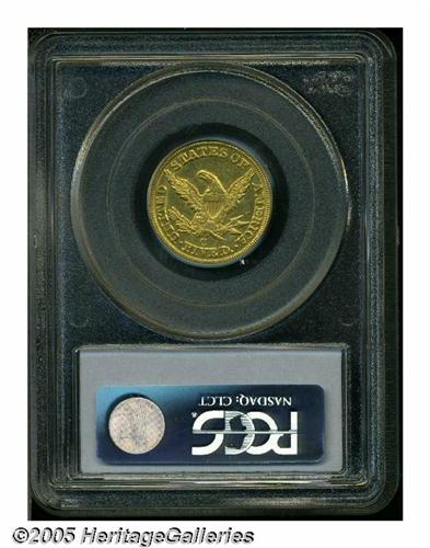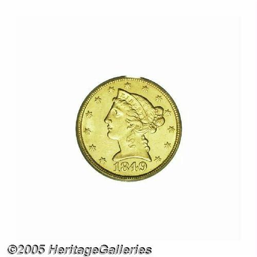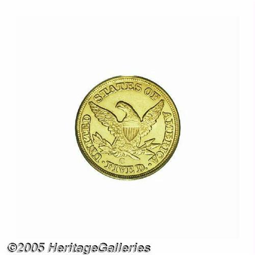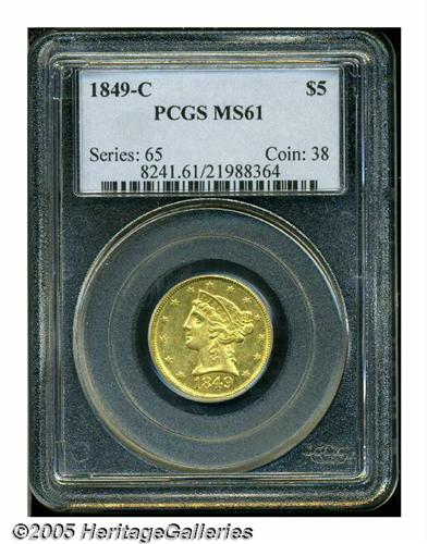 <B>1849-C<$5> MS61 PCGS.</B></I> Variety 12-F. With a mintage of 64,823 pieces, the 1849-C is the most readily obtainable C-mint Half Eagle produced prior to 1850, particularly in grades above XF, and is often chosen as a type coin. However, in Mint State, this date becomes conditionally important. This piece is just below the Condition Census, and is very sharply defined on the obverse, as usually seen, the reverse shows some softness on the eagle's neck and left (facing) leg. The fields are flashy and there is just the slightest hint of green-gold patina on each side, as well as minimal abrasions. An eye appealing, Mint State example of this Charlotte type coin. Population: 5 in 61, 6 finer (6/05).