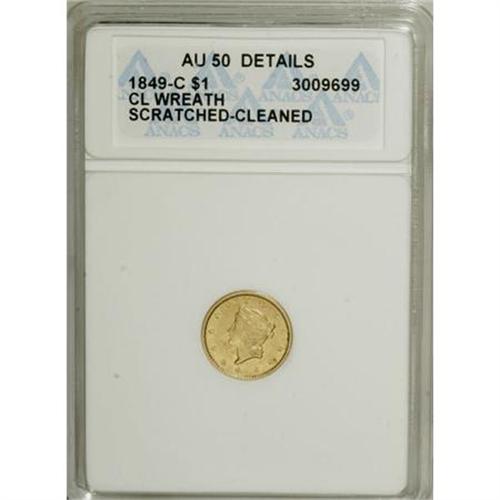 <B>1849-C G$1 Closed Wreath--Cleaned, Scratched--ANACS. AU50 Details.</B></I> NGC Census: (8/68). PCGS Population (17/45). Mintage: 11,634. Numismedia Wsl. Price for NGC/PCGS coin in AU50: $2,125. (#7505)<BR><BR><B>Coin Engraver:</B> James B. Longacre<BR><BR><b>Shipping:</b> Coins & Currency (<a target="_blank" href="http://www.heritageauctions.com/common/shipping.php">view shipping information</a>)