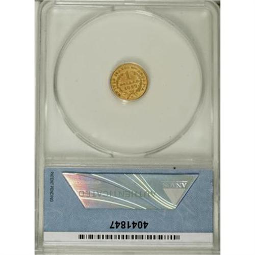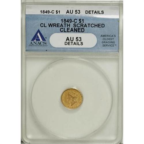 <B>1849-C G$1 Closed Wreath--Scratched, Cleaned--ANACS. AU53 Details.</B></I> Variety 2-B. A lightly cleaned representative of the first collectible Charlotte gold dollar issue. Luster is especially ample on the reverse. The hair above the ear shows faint wear. A cluster of delicate marks on the field near the chin emerges beneath a loupe.<BR><BR><B>Coin Engraver:</B> James B. Longacre<BR><BR><b>Shipping:</b> Coins & Currency (<a target="_blank" href="http://www.heritageauctions.com/common/shipping.php">view shipping information</a>)