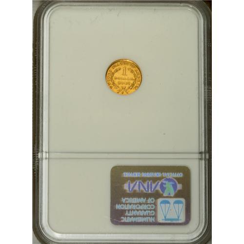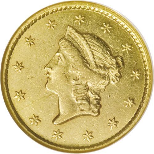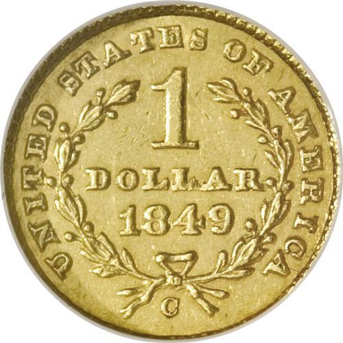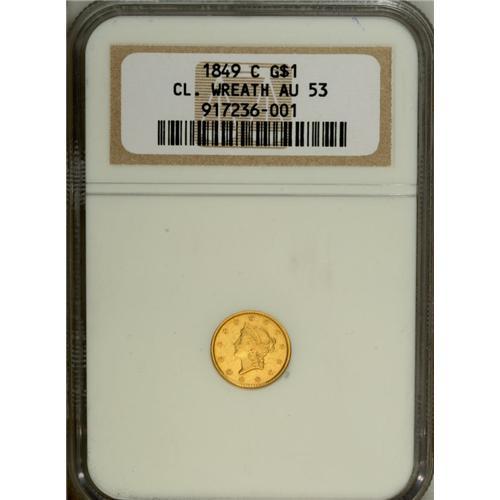 <B>1849-C G$1 Closed Wreath AU53 NGC.</B></I> Variety 2-B as always for the Closed Wreath design type. The 1849-C is relatively scarce in AU and higher levels of preservation. This AU53 example displays bright yellow-gold surfaces that have a light green tint. The design elements are well defined, save for some minor softness in Liberty's lower hair. Light, inoffensive circulation marks are noted on each side.<BR><BR><b>Shipping:</b> Coin/Currency (<a target="_blank" href="http://www.heritageauctions.com/common/shipping.php">view shipping information</a>)