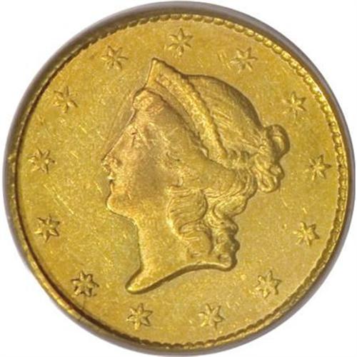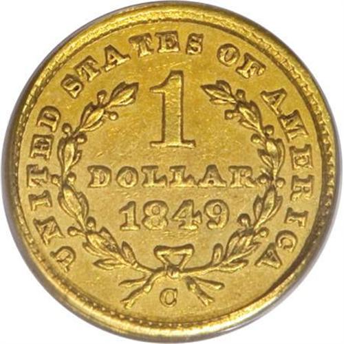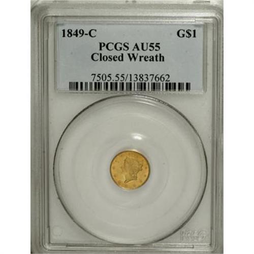 <B>1849-C G$1 Closed Wreath AU55 PCGS.</B></I> Variety 2-B. One variety is known to exist. The 1849-C Closed Wreath is the more available of the two '49-C Wreath varieties, but is still very scarce in its own right, especially in the AU55 and finer levels of preservation. This Choice AU specimen displays rich apricot-gold color with hints of underlying green, and is better struck than most seen. Minor circulation marks are visible on both sides.<BR><I>From The Pearl E. Pemberton Collection.</B></I><BR><BR><B>Coin Engraver:</B> James B. Longacre<BR><BR><b>Shipping:</b> Coins & Currency (<a target="_blank" href="http://www.heritageauctions.com/common/shipping.php">view shipping information</a>)
