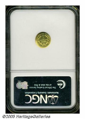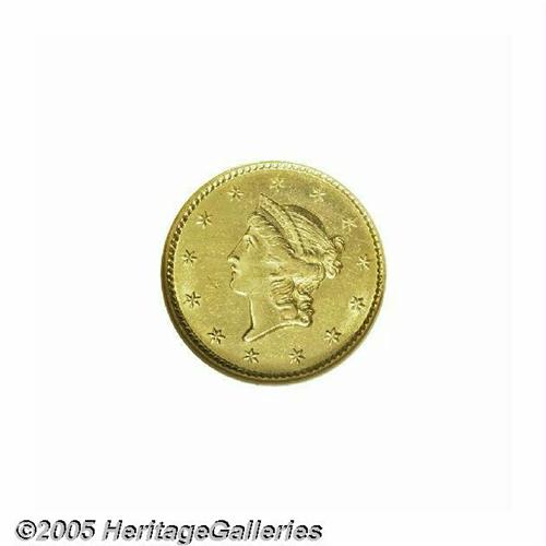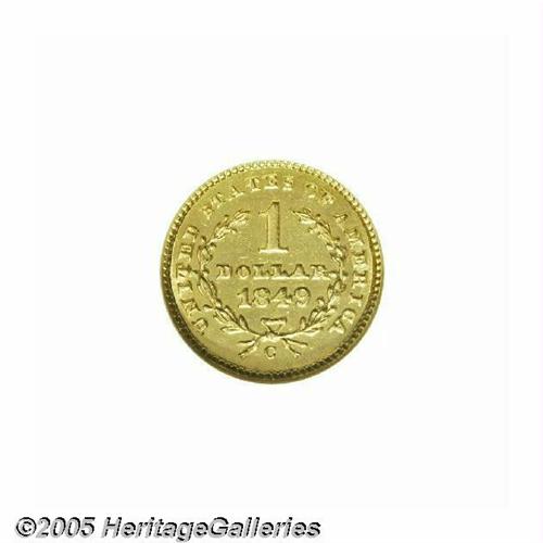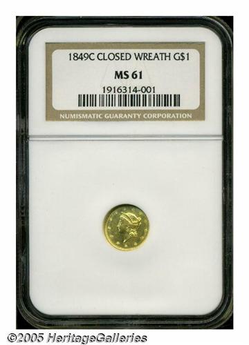 <B>1849-C<G$1> Closed Wreath MS61 NGC.</B></I> Variety 2-B. Although far more common than its Open Wreath counterpart, the 1849-C Closed Wreath is still the fourth rarest Gold Dollar struck at the Charlotte Mint. The typical survivor of this issue shows striking weakness on the hair around Liberty's face and the present coin is no exception. The reverse of this specimen is, however, well above average in terms of detail and the denticles are sharp all around. Frosty luster adorns the green-gold surfaces and there are no individually distracting contact marks.