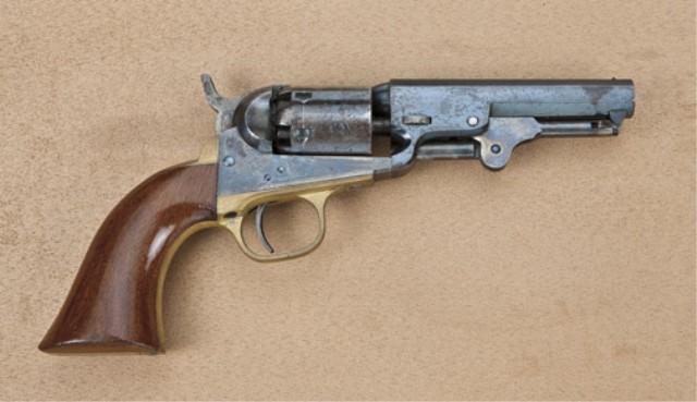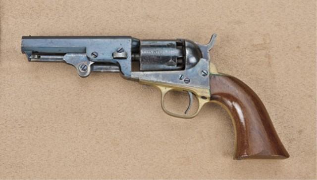 1849 Colt pocket model, .31 caliber percussion, 4” barrel, blue and case hardened finish, varnish wood grips showing one-line New York barrel address, 6-shot cylinder. Serial #275998. The revolver remains in near fine original condition showing 75-85% original blue on barrel. Some thinning at the edges, minor erosion, a few light scratches, just beginning pinprick pitting and normal aging. The cylinder shows 90% plus original cylinder scene slightly light in a few areas and approx. 60% thinning blue. An index line between cylinder stops, some light erosion and minor aging. The frame, hammer, and loading lever show 60-80% case hardening with good rainbow colors, some drifting to patina, light erosion, and just beginning aging. The backstrap and triggerguard show an even light patina and almost no trace of silver as is common on the later production as the silver was literally flashed and rubbed off easily. The varnish wood grips are very good plus to near fine with 80-90% varnish, some marks at the bottoms and edges and minimal wear. The action is crisp, most of the cylinder pins are retained. All matching visible serial numbers, excellent interior. An exceptional pocket model that saw