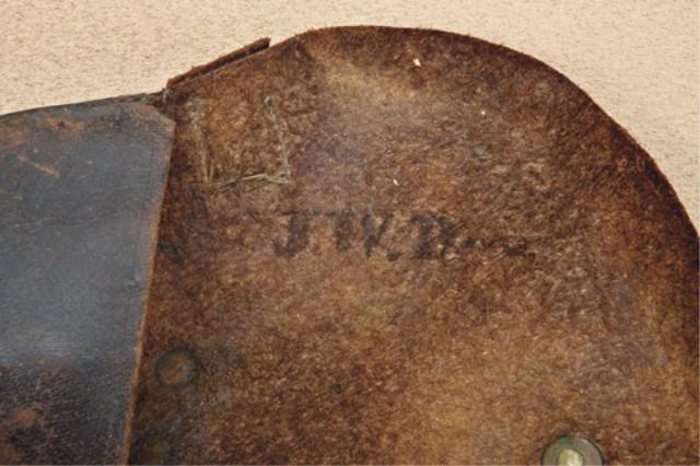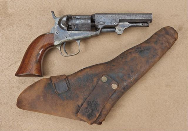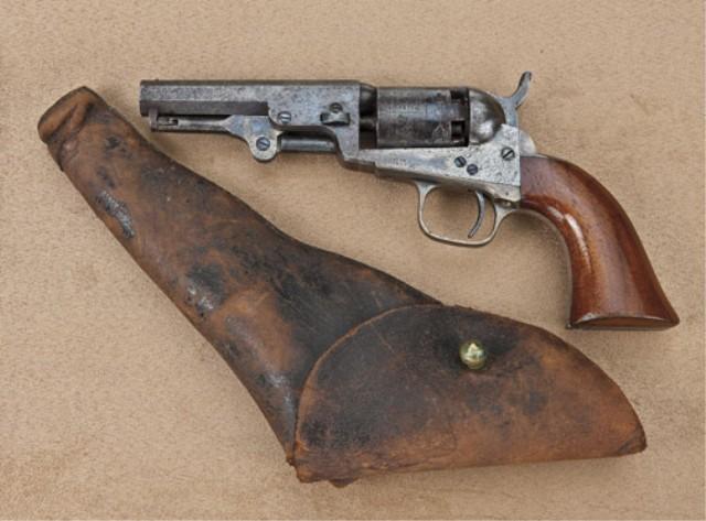 1849 Colt pocket model, .31 caliber percussion, 4” barrel, blue and case hardened finish, varnish wood grips, two-line Hartford address, 6-shot cylinder, period inscribed backstrap “J. W. Davis”. The barrel shows 10-20% original blue with the balance a mottled patina, showing some erosion and pinprick pitting that is light. The cylinder shows 90% plus original cylinder scene, approx. 30-50% original blue. An index line between cylinder stops, some scratches, and some mottling and erosion similar to the barrel are present. The frame, hammer, and loading lever show 30-50% case hardening but is thinning and drifting to grey with some light beginning erosion, pinprick pitting, and some good areas of rainbow colors mixed in. The backstrap and trigger guard show 40-60% darkened original silver, the varnish wood grips are very good plus with 75-85% varnish. Some minor imperfections, normal use, and are at least very good. All matching visible serial numbers. Tight action, good interior, generally a crisp pocket model that has seen some exposure and probably kept in its holster which is included. The included holster is a military flap style with name “J. W. Davis” penned in inner