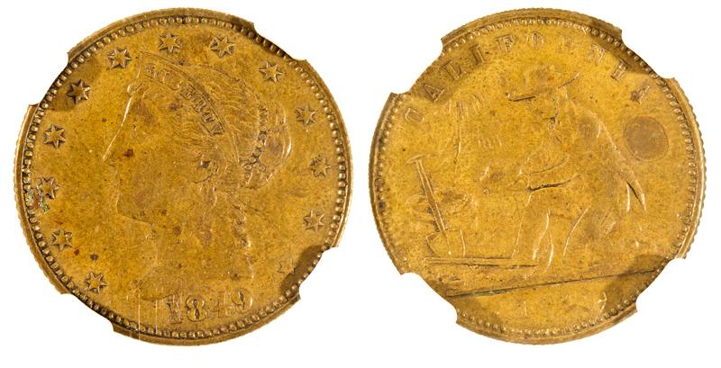 Miner counter "1849". Brass $5. Graded extremely fine. Details damage by NGC. Fauver 305.