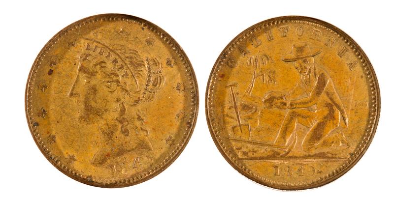 Miner Counter "1849". BSGilt $5. Grade almost uncirculated 53 by NGC. Fauvre 360.