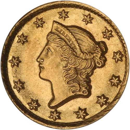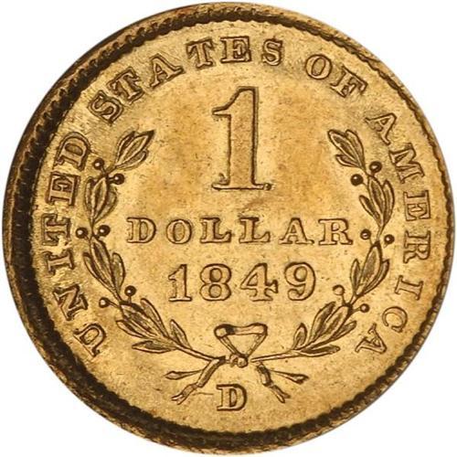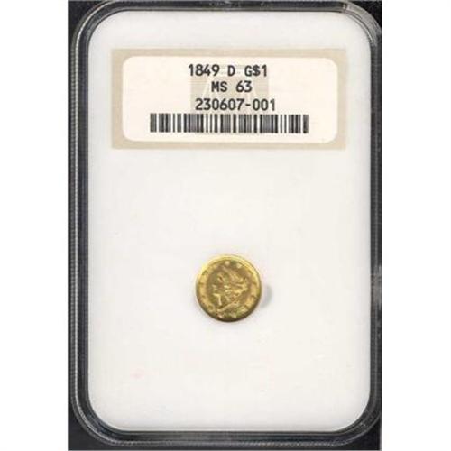 <b>1849-D $1 Gold Liberty. NGC graded MS63.</b> NGC Pop: 17/7. An estimated 250-300 examples cluster around the Extremely Fine to About Uncirculated range. There may be fewer than 30-40 known in Mint condition with most of these MS60 to MS62. The strike on this attractive MS63 is outstanding with sharp hair and star detail on the obverse; the reverse carries its weight by being better centered than usual, with a very bold date, and best of all, a nice clear mintmark. There are a few light marks here and there, but the overwhelming feature one sees is the smooth, brilliant luster. In conclusions, the overall level of eye appeal is decidedly above the average for 1849-D. Unlike many before it, this piece has a perfect "balance" between the obverse and the reverse in all their grade-defining characteristics.