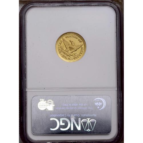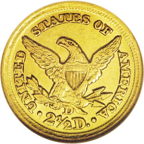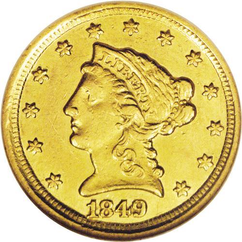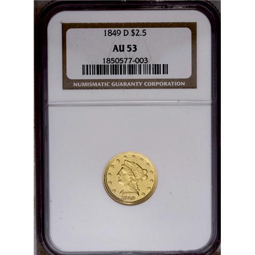 <B>1849-D<$2 1/2> AU53 NGC.</B></I> Variety 12-M. The "Low Date" variety, and the scarcer of the two die marriages known for this low mintage issue. Only 10,945 pieces were struck. This bright Dahlonega representative has a generous quotient of luster, and examination beneath a loupe fails to locate mentionable marks. The strike is generally good, with slight incompleteness noted from the eagle's neck down to the claws.