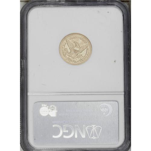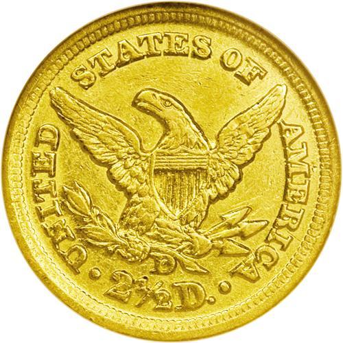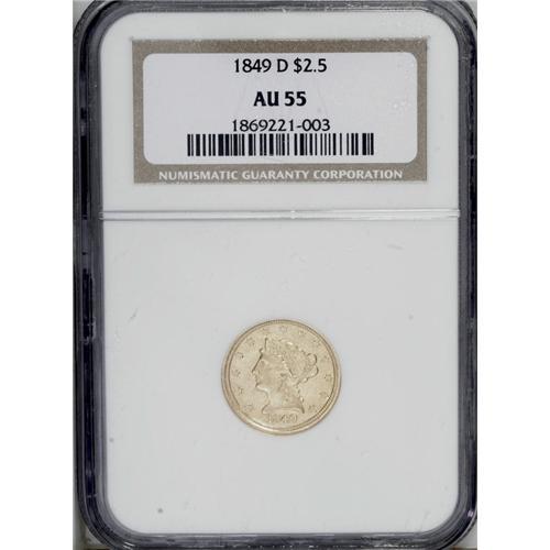 <B>1849-D<$2 1/2> AU55 NGC.</B></I> Variety 11-M. Well struck for the Dahlonega Mint, although the right (facing) claws and the hair bun exhibit minor bluntness. A clean and partly lustrous pale gold example. Visible marks are generally limited to a faint trail across the upper obverse field. A mere 10,945 pieces were struck.