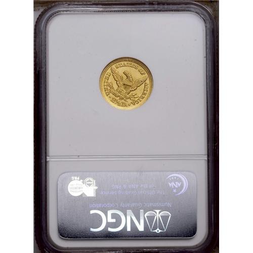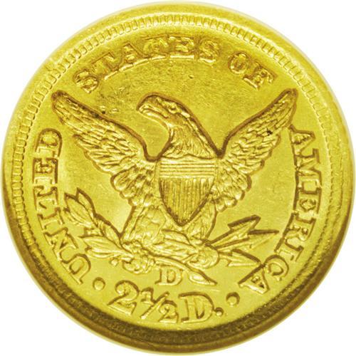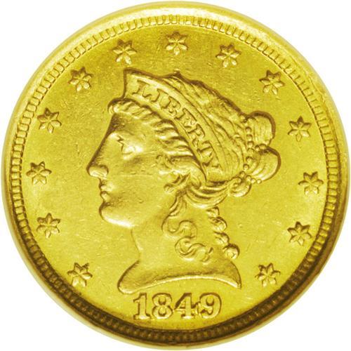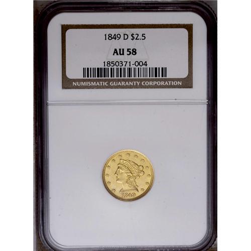 <B>1849-D<$2 1/2> AU58 NGC.</B></I> Variety 11-M. High date with the 1 distant from the border. The 1849-D is rare in Mint State or in grades approaching that level. This canary-gold specimen displays ample luster and nicely delineated design elements. Some minor handling marks are scattered over each side. Census: 43 in 58, 14 finer (5/06).