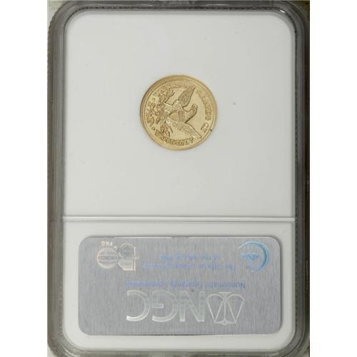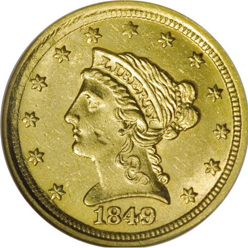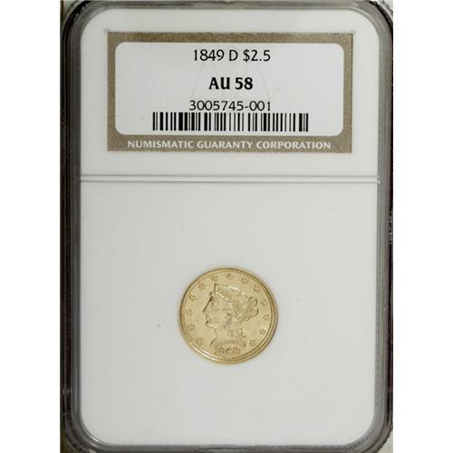 <B>1849-D $2 1/2 AU58 NGC.</B></I> Variety 11-M. High date with the 1 distant from the border. Despite an impressively low mintage of 10,945 pieces the 1849-D is a median rarity among Dahlonega quarter eagles and survivors are more likely to be found in AU or finer grade than most other D-mint issues. This bright yellow-gold example boldly approaches Mint State status, being very well struck over the major design elements and showing only intermittent bluntness at the borders. Two small dimpled areas on the portrait appear to be as struck. The dies are rotated clockwise approximately 90 degrees.<BR><BR><b>Shipping:</b> Coin/Currency (<a target="_blank" href="http://www.heritageauctions.com/common/shipping.php">view shipping information</a>)