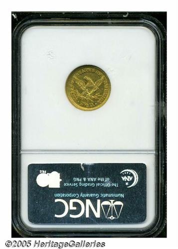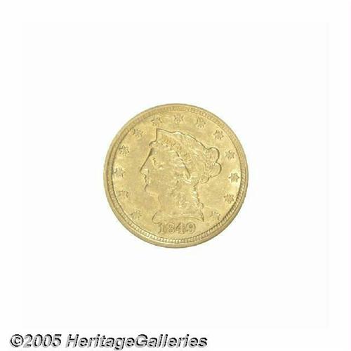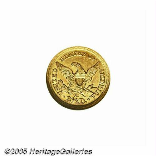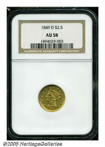 <B>1849-D<$2 1/2> AU58 NGC.</B></I> Variety 11-M. This one barely circulated as only the barest friction is seen on the high points of the design. Lustrous in the fields and sharp for this date. A scant 10,945 were issued from this Mint, and this is about as nice as most collectors can hope to obtain. Sharply struck on the obverse, including the borders, but the reverse border does show characteristic weakness. Population: 39 in 58, 12 finer (6/05).