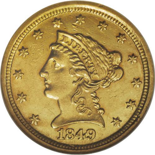 <B>1849-D $2 1/2 AU58 NGC.</B></I> Variety 11-M. Tied with numerous other AU58 coins at the bottom of the Condition Census for this scarce Dahlonega issue. Only 25-31 examples are believed known today in the various grades of AU. This is a bright coin that shows just a slight touch of friction over the highpoints and in the fields. Sharply defined on the obverse with the usual softness on the eagle's neck and leg on the reverse. Magnification reveals numerous small abrasions, but none are individually significant.<BR><BR><b>Shipping:</b> Coins & Currency (<a target="_blank" href="http://www.heritageauctions.com/common/shipping.php">view shipping information</a>)