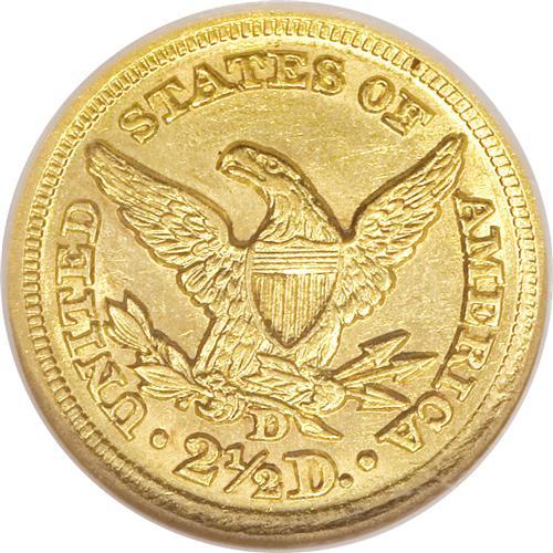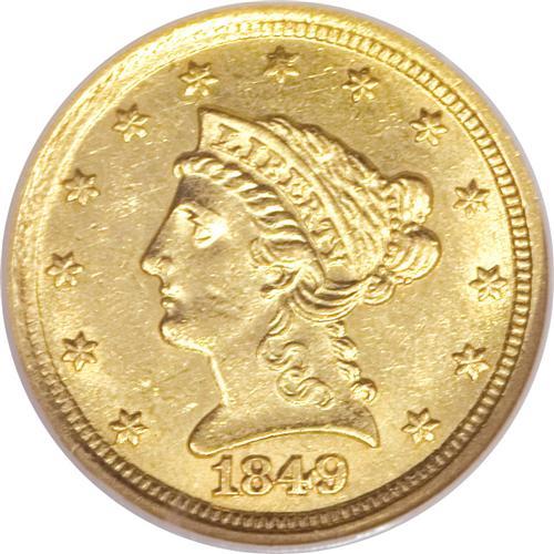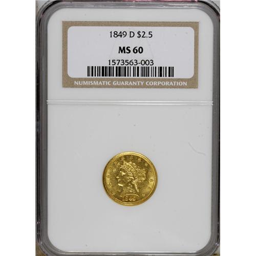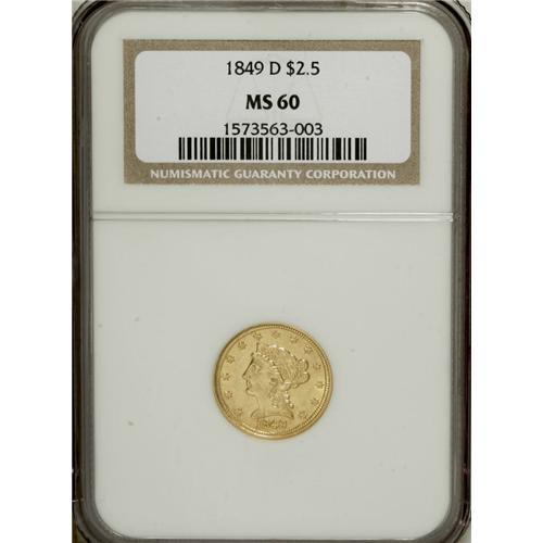 <B>1849-D $2 1/2 MS60 NGC.</B></I> Variety 11-M. High date with the 1 distant from the border; this is the more common of the two varieties. The 1849-D has a mintage of 10,945 pieces. In his second edition of <I>Gold Coins of the Dahlonega Mint, 1838-1861,</B></I> Douglas Winter estimates 115 to 135 coins have survived to the present day, mostly in Very Fine to About Uncirculated condition. The NGC/PCGS figures substantiate Winter's claim with respect to the grade distribution of extant pieces, and when likely resubmissions are taken into account, the total number of survivors as well. Sixteen Mint State coins have been graded, all between MS60 and MS62.<BR> Bright yellow-gold color covers each side of the MS60 specimen in this lot, and a relatively powerful strike is manifested in sharply defined design elements. A few light handling marks help account for the grade, and a couple of small indentations, most likely mint made, are seen on Liberty's cheek. The reverse is rotated about 45 degrees clockwise.<BR><BR><b>Shipping:</b> Coins & Currency (<a target="_blank" href="http://www.heritageauctions.com/common/shipping.php">view shipping information</a>)