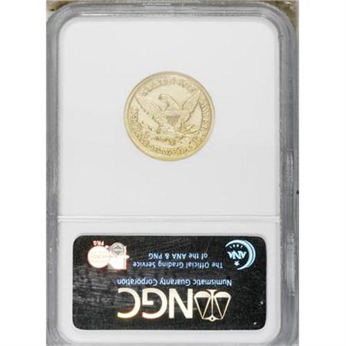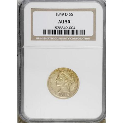 <B>1849-D $5 AU50 NGC.</B></I> Variety 22-L. The obverse offers primarily antique-gold and sun-yellow shadings, while the reverse displays whispers of green-gold as well. The fields retain ample subtle luster, though the devices exhibit light wear and numerous small marks that account for the grade. Still, a desirable Dahlonega half eagle. Census: 15 in 50, 57 finer (11/07).<BR><BR><B>Coin Engraver:</B> Christian Gobrecht<BR><BR><b>Shipping:</b> Coins & Currency (<a target="_blank" href="http://www.heritageauctions.com/common/shipping.php">view shipping information</a>)