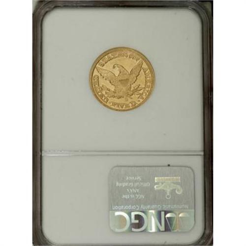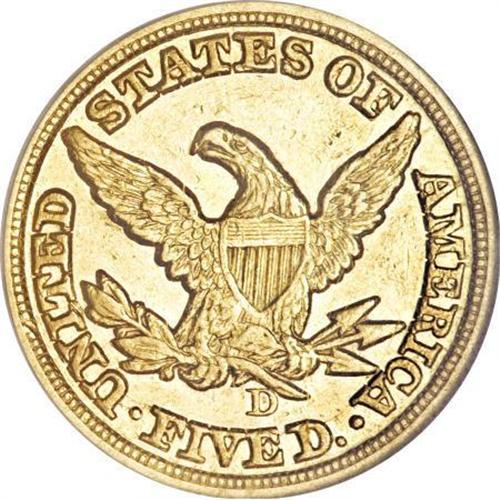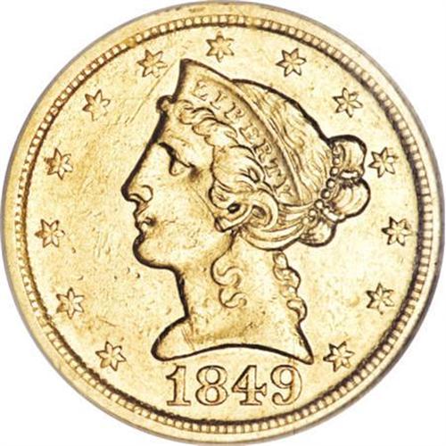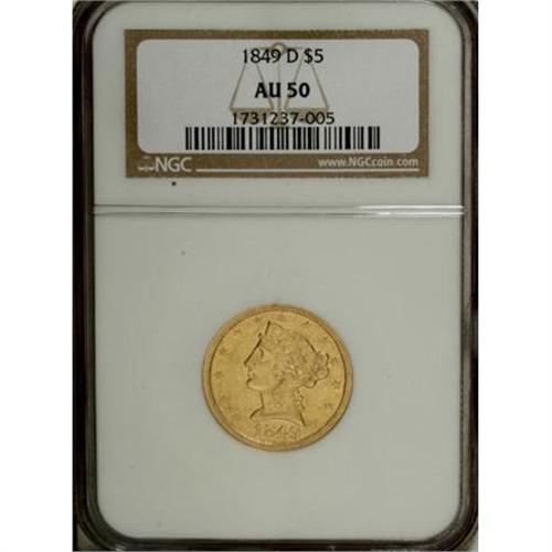 <B>1849-D $5 AU50 NGC.</B></I> Variety 22-N. A somewhat obtainable D-mint half eagle, especially in circulated grades. Of the 39,036 pieces struck, it is estimated that today only 125-150 coins remain in all grades, the majority of which are VF-XF. This is a well struck example that has bright yellow-gold color. The surfaces are peppered with numerous small abrasions, but the only one worthy of mention is in the obverse field between stars 5 and 6. <BR><BR><B>Coin Engraver:</B> Christian Gobrecht<BR><BR><b>Shipping:</b> Coins & Currency (<a target="_blank" href="http://www.heritageauctions.com/common/shipping.php">view shipping information</a>)