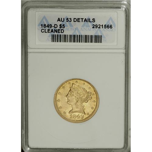 <B>1849-D $5 --Cleaned--ANACS. AU53 Details.</B></I> Variety 22-N. The reverse is thickly hairlined, but the obverse is only lightly cleaned. Luster is particularly prevalent on the reverse. A bold die crack crosses the reverse between 4 o'clock and 8:30.<BR><BR><b>Shipping:</b> Coin/Currency (<a target="_blank" href="http://www.heritageauctions.com/common/shipping.php">view shipping information</a>)