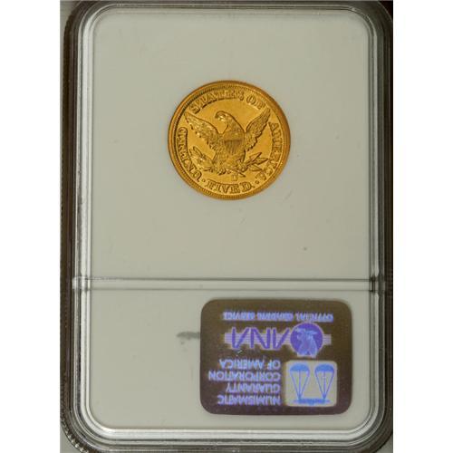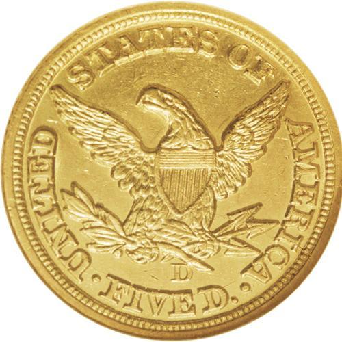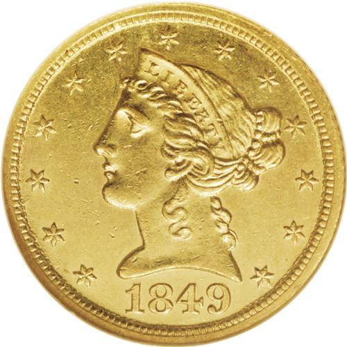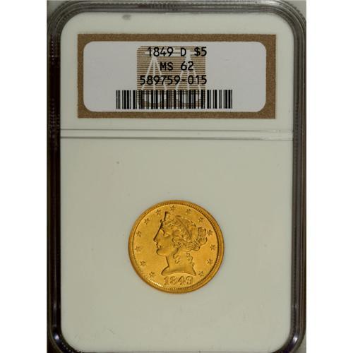 <B>1849-D $5 MS62 NGC.</B></I> Variety 22-N. A die combination that "appears to be very rare," according to Winter, though the practice of attributing Dahlonega gold by die variety is not so widespread as for other issues. What is unquestionably very rare, however, is an example in this level of preservation or finer, since the only quibble is whether enough resubmissions appear in the <I>Census</B></I> and <I>Population Report</B></I> that such pieces should be termed extremely rare instead! The coin offered here has a solid strike, better than the norm, and the partially prooflike fields have pretty luster. A number of light ticks and other marks appear on the surfaces, which are yellow-gold with a touch of green, but these are well-distributed, and the overall visual appeal is strong.<BR><BR><b>Shipping:</b> Coin/Currency (<a target="_blank" href="http://www.heritageauctions.com/common/shipping.php">view shipping information</a>)