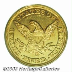 1849-D $5 MS62 PCGS. Variety 22-L. (per Doug Winter's second edition and revised attribution system). Centered date; high reverse mintmark that touches both the stem and the feather. This is one of three varieties known for this issue.RARITY INFORMATION: The 1849-D half eagle is a scarce and overlooked coin. There are approximately 125-150 pieces known and most grade from VF25 to XF45. Around two dozen AU coins exist and we can account for just four or five in Uncirculated. The finest is the PCGS MS63 in the Duke's Creek Collection. As of November 2003, the PCGS Population Report shows seven coins graded MS62 but we believe that this has been inflated by resubmissions and the actual number is more likely only three or four coins.STRIKE: Some weakness can be seen on the curls below BERT in LIBERTY, as often seen on 1849-D half eagles. The reverse is better struck than usual with some minor weakness seen on the arrow feathers and the eagle's claws. The overall quality of strike is definitely above average.SURFACES: There are hairlines on the obverse and reverse, indicating that this coin may have been lightly wiped many years ago. A few trivial marks are in the fields but these are much lighter than usual for this issue. There is no mint-made granularity as on many 1849-D half eagles.LUSTER: The luster is slightly reflective. Most 1849-D half eagles have poor luster and the few higher grade pieces that have been available in recent years are more frosty than prooflike in texture.COLORATION: At some point, after the Milas Collection was sold (see the pedigree information below) someone added orange-gold coloration to this coin in an attempt to conceal the light hairlines. This was performed with reasonably good skill and this coin still has a nice appearance.EYE APPEAL: This is a well struck example with good luster and a lack of detracting marks.COMPARABLES: The Bass IV: 419 coin, sold by Bowers and Merena in November 2000 and graded MS62 by PCGS, brought $18,400. The Heritage 1999 ANA: 7686 coin, sold in August 1999 and also graded MS62 by PCGS, brought $12,075.PEDIGREE: Ex: Doug Winter and William Miller Collection (Heritage, 2/99), lot 6266 ($19,800); New World Rarities; New York Gold Mart (Ron Karp); Numisma '95 (Stack's/RARCOA/Akers,11/95), lot 1464, where it brought $13,200; Winthrop Carner; Ed Milas Collection (Stack's, 5/95), lot 477, where it was hammered down for an impressive $18,700; Auction '84 (Stack's session, 8/84), lot 1341, where it realized $17,600; Arthur Montgomery Collection; Hancock and Harwell. This is the plate coin the second edition of the Winter book on Dahlonega gold and it is listed in the current Condition Census as tied for the second finest known. Important notice: Heritage usually auctions material at the rate of 200-250 lots per hour. On some occasions eBay Live bid software or the Internet may not be able to keep up with the pace of the auction. We recommend placing a realistic absentee bid now as insurance to avoid disappointment. Occasionally the auctioneer may eliminate or reject an eBay Live bid, and the auctioneer may also reopen a lot after the close of the eBay live bidding (usually because we missed an audience bid), and may reject your bid even if it shows you as the winning bidder. By bidding via eBay Live, you agree that Heritage may award the lot to another bidder at its sole discretion under the circumstances described above or any other reasonable circumstances. Also please note that all Heritage lots purchased through eBay Live carry a 20% Buyer's Premium. Please make sure you read the Terms and Conditions before you bid.