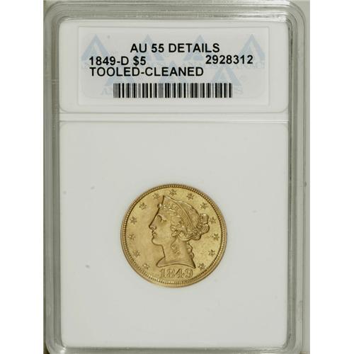 1849-D $5 --Tooled, Cleaned--ANACS. AU55 Details. Varie