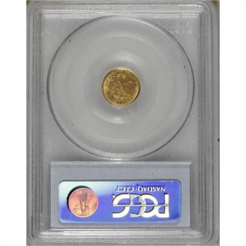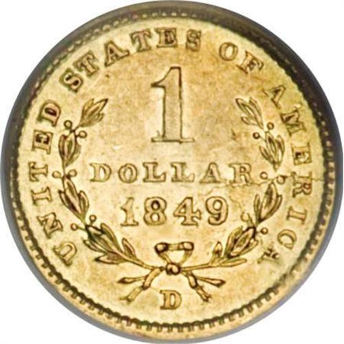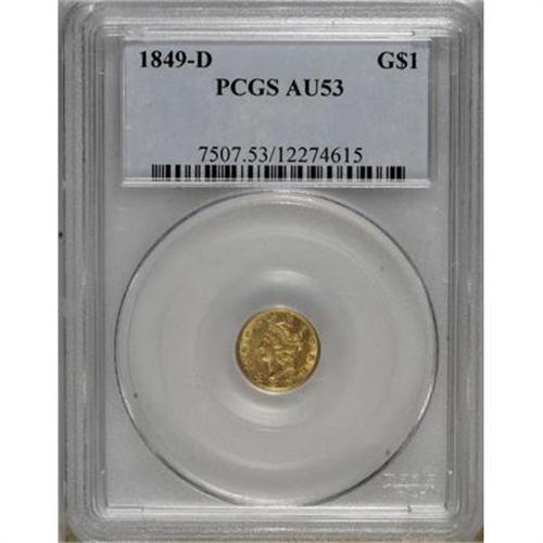 <B>1849-D G$1 AU53 PCGS.</B></I> Variety 1-B. The more elusive of two varieties for the issue, identifiable by a centered-mintmark reverse that shows a die crack below the wreath. This well struck first-year gold dollar retains lively luster in the radiant yellow-gold fields. Minimally marked with only modest wear across the highest design elements. An attractive piece that should find a home with an appreciative Southern gold enthusiast.<BR><BR><B>Coin Engraver:</B> James B. Longacre<BR><BR><b>Shipping:</b> Coins & Currency (<a target="_blank" href="http://www.heritageauctions.com/common/shipping.php">view shipping information</a>)