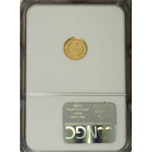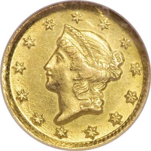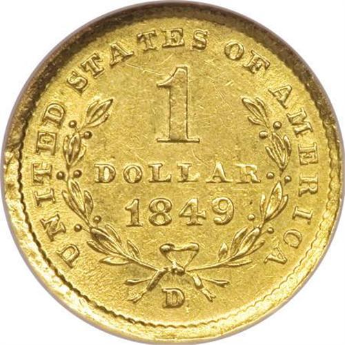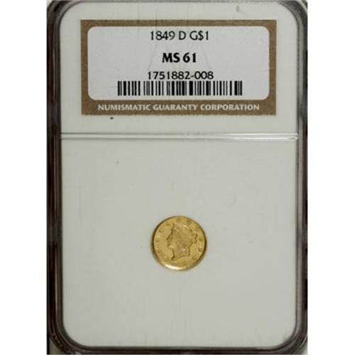 <B>1849-D G$1 MS61 NGC.</B></I> Variety 1-A. Frosty surfaces provide a base for brilliant light yellow luster. A few minor obverse scratches limit the grade. Typical of the issue, the central obverse hair details are blunt. While the date is plentiful, demand exists from type collectors who seek first year of issue coins or those from the Southern mints.<BR><BR><B>Coin Engraver:</B> James B. Longacre<BR><BR><b>Shipping:</b> Coins & Currency (<a target="_blank" href="http://www.heritageauctions.com/common/shipping.php">view shipping information</a>\)