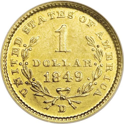 <B>1849-D<G$1> MS62 NGC.</B></I> Variety 1-B. The scarcer of the two known reverse dies for this issue, which has a low production of 21,588 pieces. The sole Open Wreath Dahlonega issue, and thus requisite for an advanced type set from the Georgian facility. This example is well struck and unmarked. The obverse field is moderately prooflike. Census: 38 in 62, 24 finer (8/06).