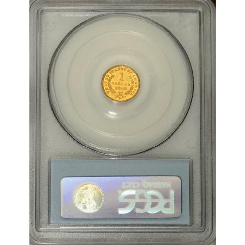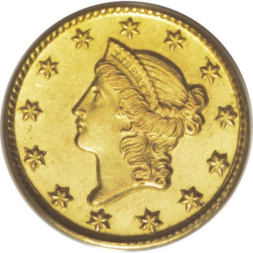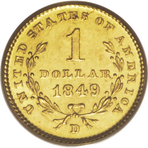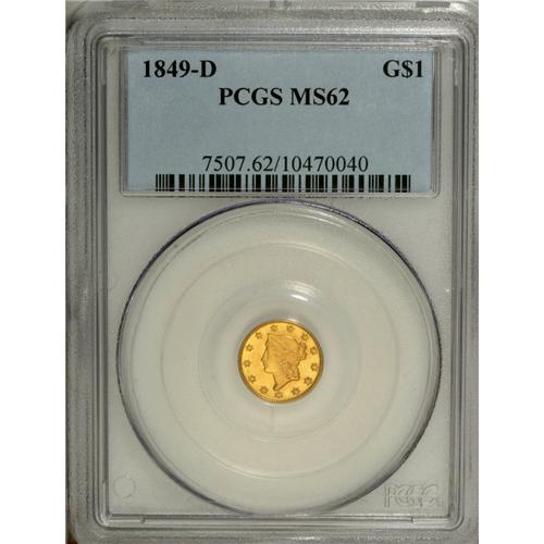 <B>1849-D G$1 MS62 PCGS.</B></I> Variety 1-B. A rare die pairing, since the A reverse is usual. Boldly struck with noticeable doubling on the portrait and the obverse stars. An attractive green-gold representative with satin luster and few surface blemishes. A few wispy hairlines are noted in the fields. Population: 26 in 62, 12 finer (12/06).<BR><BR><b>Shipping:</b> Coin/Currency (<a target="_blank" href="http://www.heritageauctions.com/common/shipping.php">view shipping information</a>)