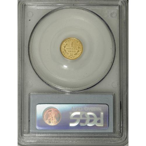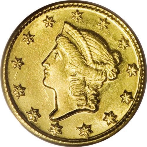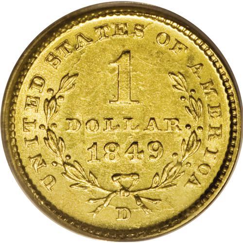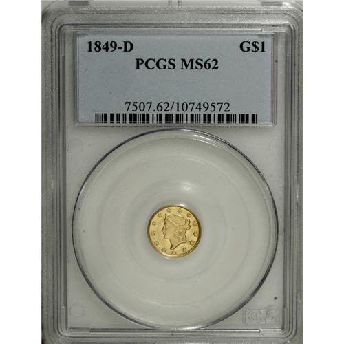 <B>1849-D G$1 MS62 PCGS.</B></I> Variety 1-B. This first-year issue was apparently saved in considerable numbers, making it generally available in the lower Mint State grades. The Reverse B of 1849, known without die cracks and with extensive cracks, as here, was produced to solve the blurry reverse problem created by the Reverse A die. A die crack runs through the mintmark, connecting both bow ribbons and into the right field. Another crosses from the rim at 8 o'clock through the N in UNITED and an olive berry, onward to the center and from the left wreath tip through ATES and to the rim. Brilliant luster radiates from the yellow-gold surfaces. A small planchet flake shows on the reverse below the date, along with light, grade-consistent abrasions and field scuffs.<BR><BR><b>Shipping:</b> Coins & Currency (<a target="_blank" href="http://www.heritageauctions.com/common/shipping.php">view shipping information</a>)