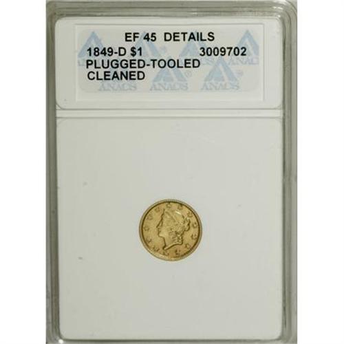 <B>1849-D G$1 --Cleaned, Plugged, Tooled--ANACS. XF45 Details.</B></I> NGC Census: (14/241). PCGS Population (23/164). Mintage: 21,588. Numismedia Wsl. Price for NGC/PCGS coin in XF45: $1,636. (#7507)<BR><BR><B>Coin Engraver:</B> James B. Longacre<BR><BR><b>Shipping:</b> Coins & Currency (<a target="_blank" href="http://www.heritageauctions.com/common/shipping.php">view shipping information</a>)
