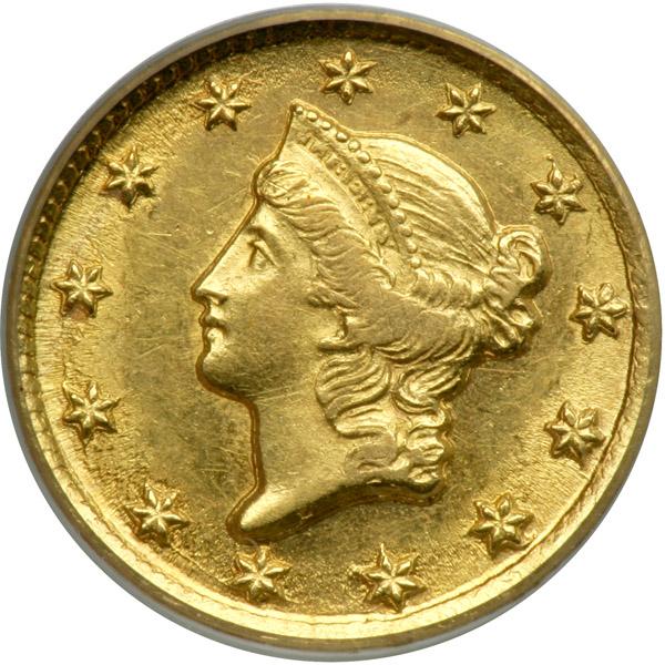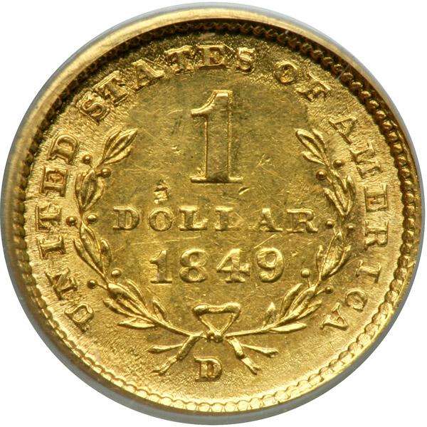 1849-D PCGS graded Genuine. Only 21,588 struck. Our grade is AU55 with some digs on the reverse . Still lustrous; still appreciably better than most (which tend to be heavily circulated) (PCGS # 7507) .