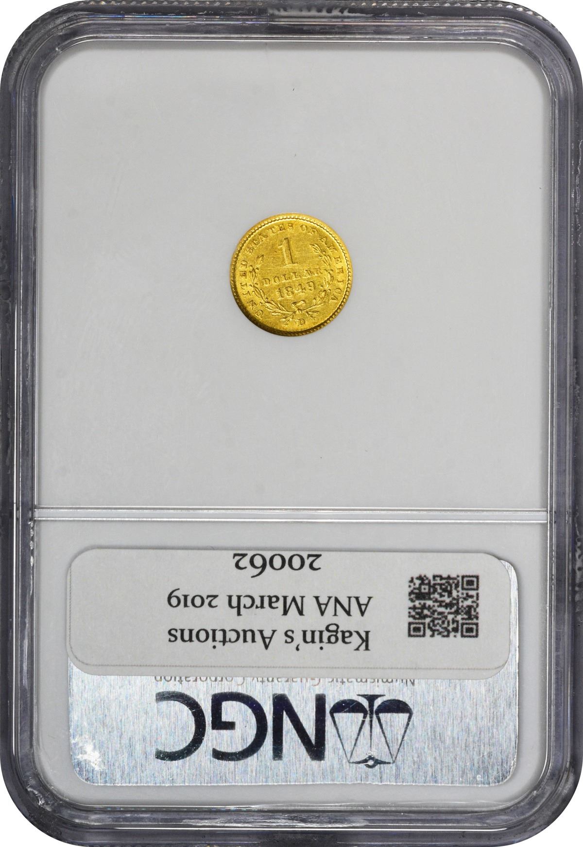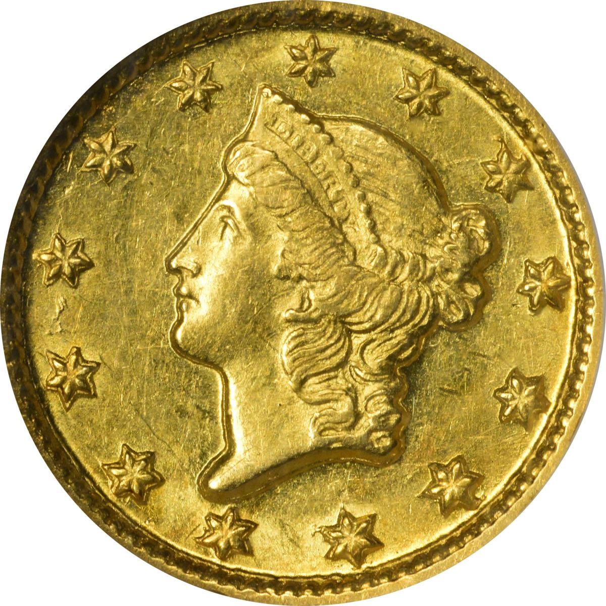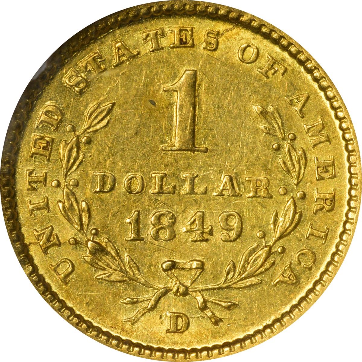 Satiny deep yellow-gold with a high degree of luster and an equal amount of eye appeal. Lively mint frost plays among the devices and protected areas of the fields. Notably unmarked to the unaided eye, and choice for the assigned grade. A centered D mintmark and several bold die cracks are seen on this reverse; the end of this die was not far off! The Winter reference suggests the present variety is somewhat scarcer than variety 1A of the date. A great opportunity to add a piece of Dahlonega gold from the first year of the gold dollar denomination to your growing collection.