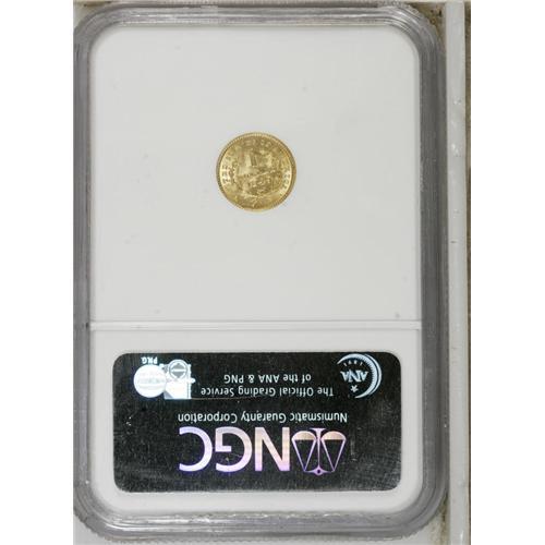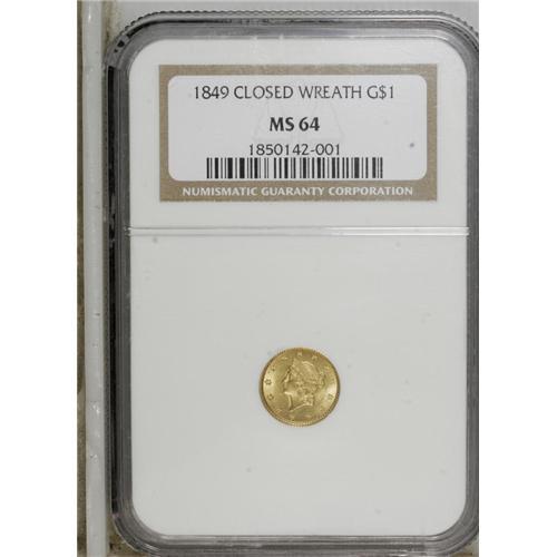 <B>1849 G$1 Closed Wreath MS64 NGC.</B></I> Large Head, With L. This lustrous and undisturbed honey-gold near-Gem is generally boldly struck, although a few letters in the central reverse legends lack complete sharpness.<BR><BR><b>Shipping:</b> Coins & Currency (<a target="_blank" href="http://www.heritageauctions.com/common/shipping.php">view shipping information</a>) <BR><BR><B>Importan