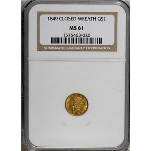 <B>1849 G$1 Closed Wreath MS61 NGC.</B></I> NGC Census: (0/0). PCGS Population (6/103). (#7503)<BR><BR><B>Coin Engraver:</B> James B. Longacre<BR><BR><b>Shipping:</b> Coins & Currency (<a target="_blank" href="http://www.heritageauctions.com/common/shipping.php">view shipping information</a>)