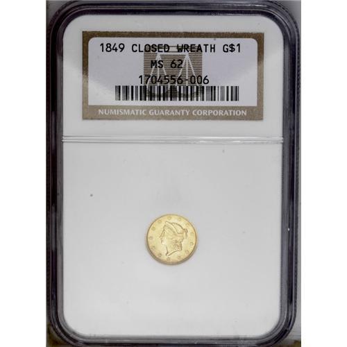 1849 G$1 Closed Wreath MS62 NGC. 1849[G$1] Closed Wreath MS62 NGC.
