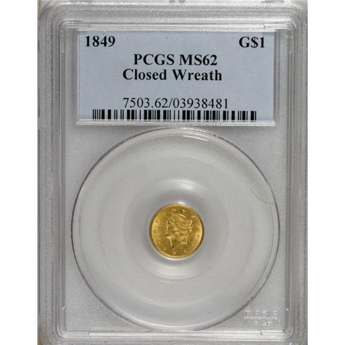 <B>1849 G$1 Closed Wreath MS62 PCGS.</B></I> Large head, with L. Liberty's hair is exquisitely struck on this smooth and satiny piece. A few nearly imperceptible hairlines limit the grade. Struck from multiply clashed dies.<BR><BR><b>Shipping:</b> Coins & Currency (<a target="_blank" href="http://www.heritageauctions.com/common/shipping.php">view shipping information</a>)