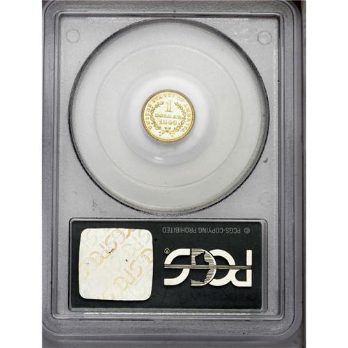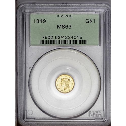 <B>1849<G$1> Closed Wreath MS63 PCGS.</B></I> Large Head, With L. The wreath ends near the top of the 1 denomination. Greenish-gold surfaces exhibit radiant luster. All of the design elements are well brought up, including a strong LIBERTY. A few light handling marks are noted on the obverse. An exceptionally sharp piece for the grade. <BR><BR><B>Important notice:</B> Heritage usually auctions material at the rate of 200-250 lots per hour. On some occasions eBay Live bid software or the Internet may not be able to keep up with the pace of the auction. We recommend placing a realistic absentee bid now as insurance to avoid disappointment. Occasionally the auctioneer may eliminate or reject an eBay Live bid, and the auctioneer may also reopen a lot after the close of the eBay live bidding (usually because we missed an audience bid), and may reject your bid even if it shows you as the winning bidder. By bidding via eBay Live, you agree that Heritage may award the lot to another bidder at its sole discretion under the circumstances described above or any other reasonable circumstances. Since eBay bids are not shown to us until we open the lot on the floor, we treat those bids just like floor bids. In most cases the floor responds before the eBay bid is presented to us, due to Internet lag time, so for consistency we have made it a policy that floor bids are always considered first over tie eBay live bids. Also please note that all Heritage lots purchased through eBay Live carry a 20% Buyer's Premium. Please make sure you read the Terms and Conditions before you bid. This lot is being auctioned in conjunction with a live floor auction by Heritage Galleries & Auctioneers. All final auction and invoice information will be supplied by Heritage Galleries & Auctioneers, and all other information should be considered preliminary. Lot:2246 <BR><BR><B>Winning Notification and Billing:</B> After the FINAL session in this auction is complete, Heritage will send e-mail and snail mail invoices. This process normally takes several days. All final auction and invoice information will be supplied by Heritage Galleries & Auctioneers, and all other information should be considered preliminary. <BR><BR>This auction will be conducted on a live auction floor and over the Internet through eBay Live. If you choose to place an absentee bid, please take a moment to <font color='#0000ff'><u><a href='http://pages.ebay.com/liveauctions/help/before/laabsentee.html'>learn how eBay Live absentee bidding works</a></u></font><font color='#000000'>