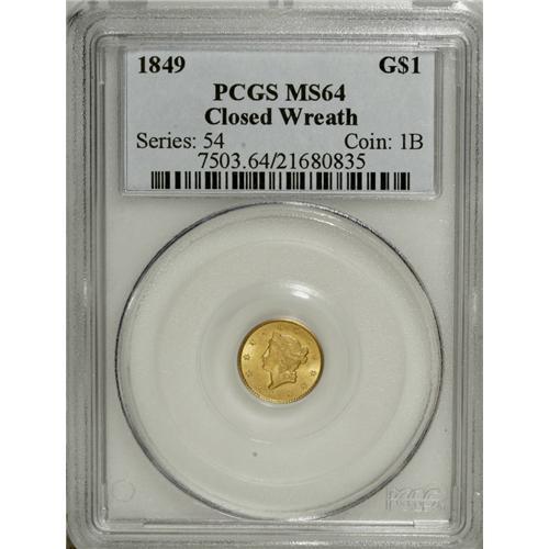 <B>1849 G$1 Closed Wreath MS64 PCGS.</B></I> Large Head, With L. Bright lustrous surfaces yield a greenish-gold cast. Sharply struck, with no marks worthy of individual mention. Population: 37 in 64, 14 finer (11/06).<BR><BR><b>Shipping:</b> Coin/Currency (<a target="_blank" href="http://www.heritageauctions.com/common/shipping.php">view shipping information</a>)