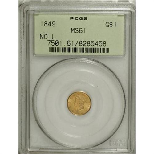 <B>1849 G$1 No L MS61 PCGS.</B></I> A mere 1,000 pieces were struck of this initial date, but No-L gold dollars have been an overlooked issue despite that low mintage. This is a sharply defined example that has lovely peach-gold color imbued with mint-green accents, over satiny surfaces that show only trivial marks and grazes. <BR><BR><B>Coin Engraver:</B> James B. Longacre<BR><BR><b>Shipping:</b> Coins & Currency (<a target="_blank" href="http://www.heritageauctions.com/common/shipping.php">view shipping information</a>)