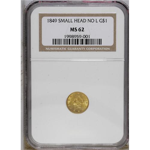 <B>1849 G$1 No L MS62 NGC.</B></I> Nicely struck with pretty luster. The yellow-gold surfaces have no trace of wear, though modest abrasions appear on each side. One of just 1,000 Open Wreath, No L pieces struck.<BR><BR><b>Shipping:</b> Coin/Currency (<a target="_blank" href="http://www.heritageauctions.com/common/shipping.php">view shipping information</a>)