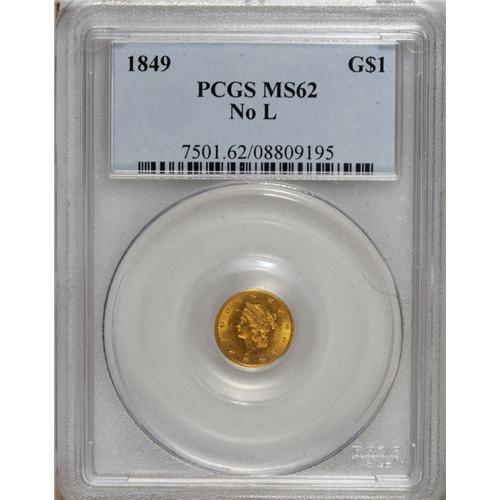 <B>1849 G$1 No L MS62 PCGS.</B></I> The three lowest stars are repunched, a characteristic of this popular introductory subtype. This well struck orange-gold piece is impressive for the grade apart from a faint mark from the nose to star 3.<BR><BR><b>Shipping:</b> Coins & Currency (<a target="_blank" href="http://www.heritageauctions.com/common/shipping.php">view shipping information</a>)