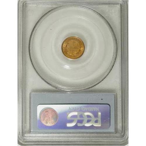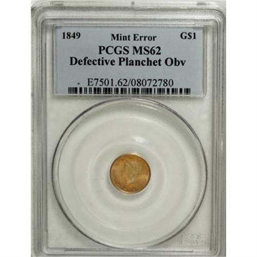 <B>1849 G$1 No L--Defective Planchet (Obverse)--MS62 PCGS.</B></I> Though not noted on the holder, the widely repunched star below the tip of the bust identifies this piece as the elusive No L variety. The vivid rose-tinged orange-gold surfaces of this warmly lustrous piece show a mint-green planchet flaw just above the truncation of the portrait.<BR><BR><B>Coin Engraver:</B> James B. Longacre<BR><BR><b>Shipping:</b> Coins & Currency (<a target="_blank" href="http://www.heritageauctions.com/common/shipping.php">view shipping information</a>)