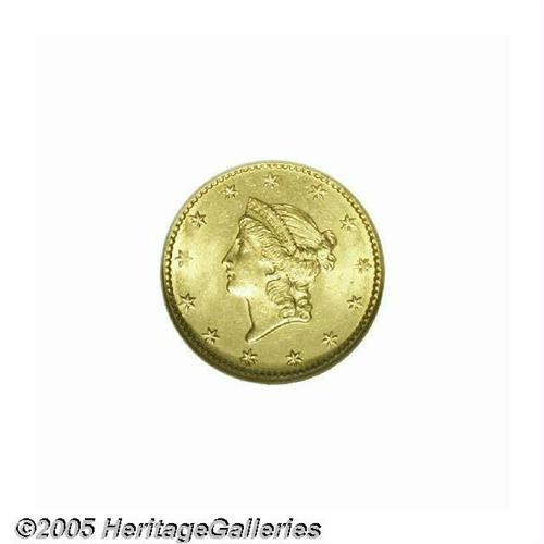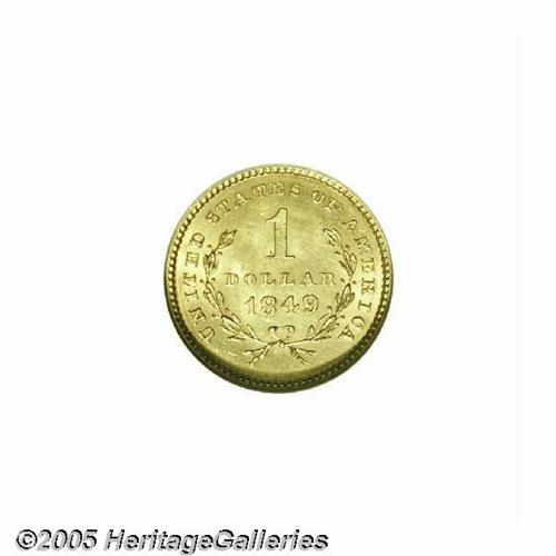 <B>1849<G$1> No L MS65 NGC.</B></I> Small head. A Gem example of this first-year issue, struck before Longacre's initial was placed on the truncation of Liberty. This is an exceptionally attractive coin that displays rich, frosted mint luster and a strong strike. Very few abrasions are seen on the obverse, while magnification reveals a few tiny marks on the reverse. A lovely Gem.
