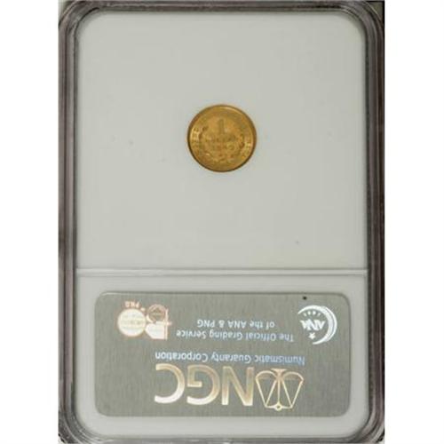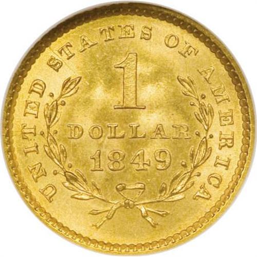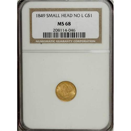 <B>1849 G$1 No L MS68 NGC.</B></I> The official mintage of the No L gold dollar is 1,000 pieces, all of which were struck on May 8, 1849. Over the years we have seen quite a number of these pieces, enough to make us wonder if the official mintage is correct. On the other hand, it would stand to reason that a large percentage of the production would be set aside by officials as well as the general public as novelties and mementoes. This preservation in high grade was recognized by Paul Taglione in 1982, when he wrote: "A good number of the 1000 were saved and clearly circulated examples (Extremely Fine and lower) are rarely encountered and little cared about." Also noted by Taglione 25 years ago, this variant was not listed in the <I>Guide Book</B></I>. That oversight has now been corrected.<BR> While a large percentage of the original mintage appears to have been saved, few coins can rival the preservation of surfaces seen on this piece. In fact, only two other pieces have been certified at this lofty level, all three are NGC encapsulated. As expected, this exquisite coin is nearly flawless with no abrasions or breaks in the luster apparent. Both sides exhibit rich, even copper-gold color and the mint luster is thick and frosted. Fully struck in all areas. A couple of vertical die breaks are present on the upper part of the reverse, indicating this was not one of the first coins produced, and it also is indicative of the excessive pressure used to strike these pieces--undoubtedly from the Mint's unfamiliarity with the production of this small format gold coin.<BR><BR><B>Coin Engraver:</B> James B. Longacre<BR><BR><b>Shipping:</b> Coins & Currency (<a target="_blank" href="http://www.heritageauctions.com/common/shipping.php">view shipping information</a>\)