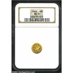 1849 G$1 Open Wreath MS61 NGC. A lustrous and well struck coin that has a few wispy handling marks i