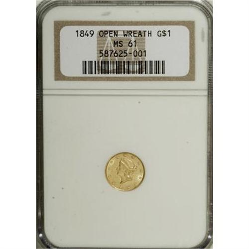 1849 G$1 Open Wreath MS61 NGC. NGC Census: (256/96