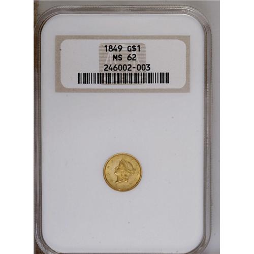 1849 G$1 Open Wreath MS62 NGC. Large Head. A mustard-g 1849[G$1] Open Wreath MS62 NGC.
