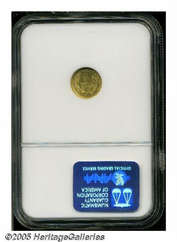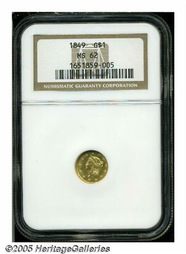 <B>1849<G$1> Open Wreath MS62 NGC.</B></I> Large Head, With L. Yellow-gold lustrous surfaces display adequately struck design features, except for portions of Liberty's hair near the ear, and the second L in DOLLAR. Several minute handling marks are noted over each side.