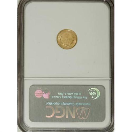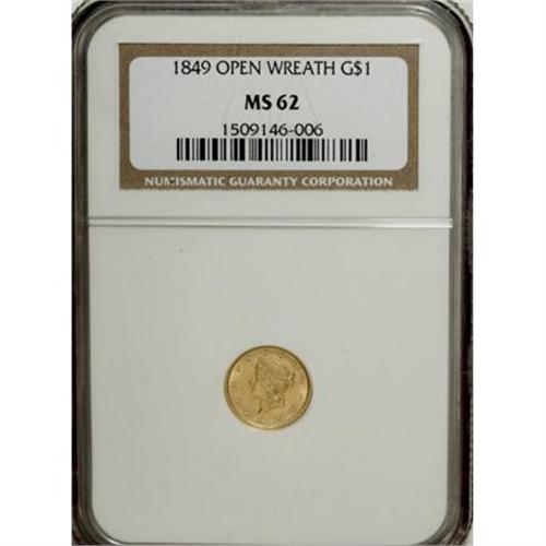 <B>1849 G$1 Open Wreath MS62 NGC.</B></I> A delicate and delightful green-gold representative of the one-year Open Wreath design. Crisply struck and lustrous with a number of wispy, yet grade-defining abrasions in the obverse fields.<BR><BR><B>Coin Engraver:</B> James B. Longacre<BR><BR><b>Shipping:</b> Coins & Currency (<a target="_blank" href="http://www.heritageauctions.com/common/shipping.php">view shipping information</a>)