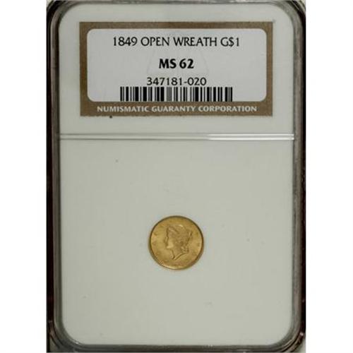 <B>1849 G$1 Open Wreath MS62 NGC.</B></I> . NGC Census: (416/593). PCGS Population (223/451). Mintage: 687,500. Numismedia Wsl. Price for NGC/PCGS coin in MS62: $600. (#7502)<BR><BR><B>Coin Engraver:</B> James B. Longacre<BR><BR><b>Shipping:</b> Coins & Currency (<a target="_blank" href="http://www.heritageauctions.com/common/shipping.php">view shipping information</a>)